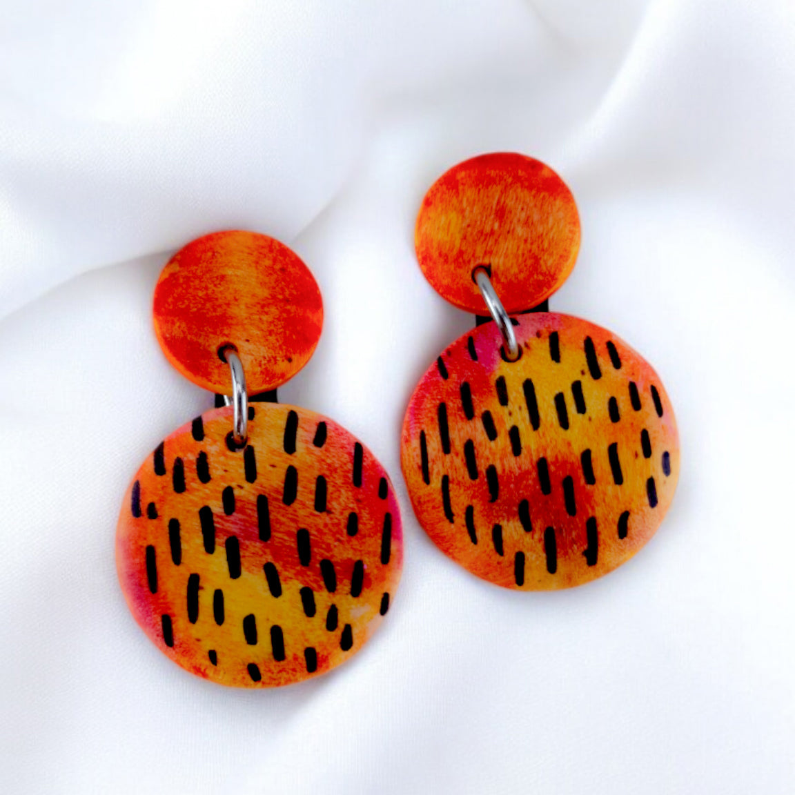 Este par de brincos apresenta um design vibrante em tons de laranja e amarelo, com um padrão geométrico em preto que adiciona um contraste marcante. Cada brinco é pintado à mão, garantindo uma peça única e cheia de personalidade.