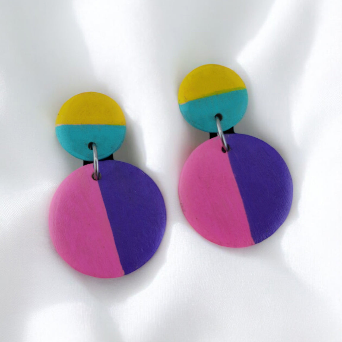 Este elegante par de brincos apresenta um design color block com círculos divididos ao meio, cada metade numa cor diferente. Pintados à mão, cada brinco oferece uma combinação ousada e sofisticada de cores, criando um efeito visual moderno e atraente.