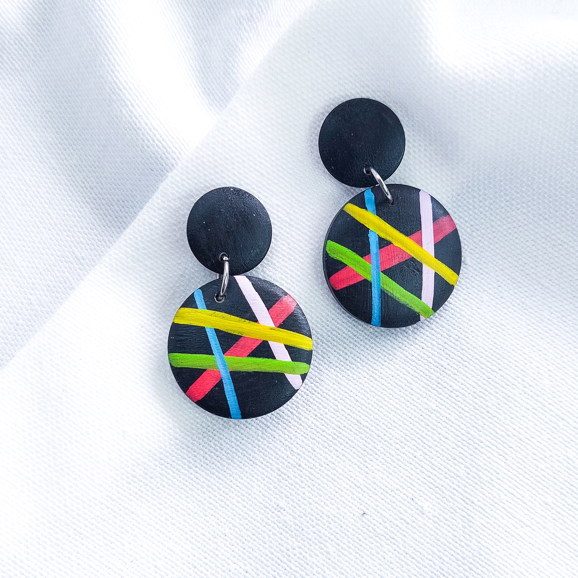 Este par de brincos em madeira preta destaca-se pelos seus riscos coloridos, criando um design vibrante e contemporâneo.