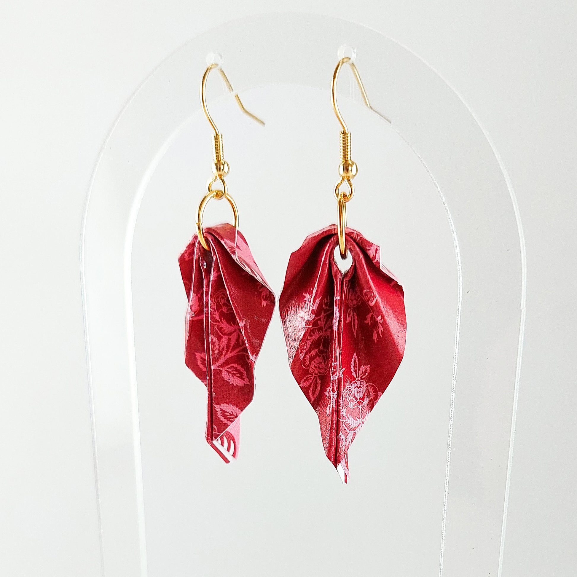 Estes brincos em origami apresentam um design exclusivo em formato de folha, meticulosamente dobrados à mão em papel envernizado e resistente. Cada peça adiciona um toque natural e diferenciado ao seu visual.