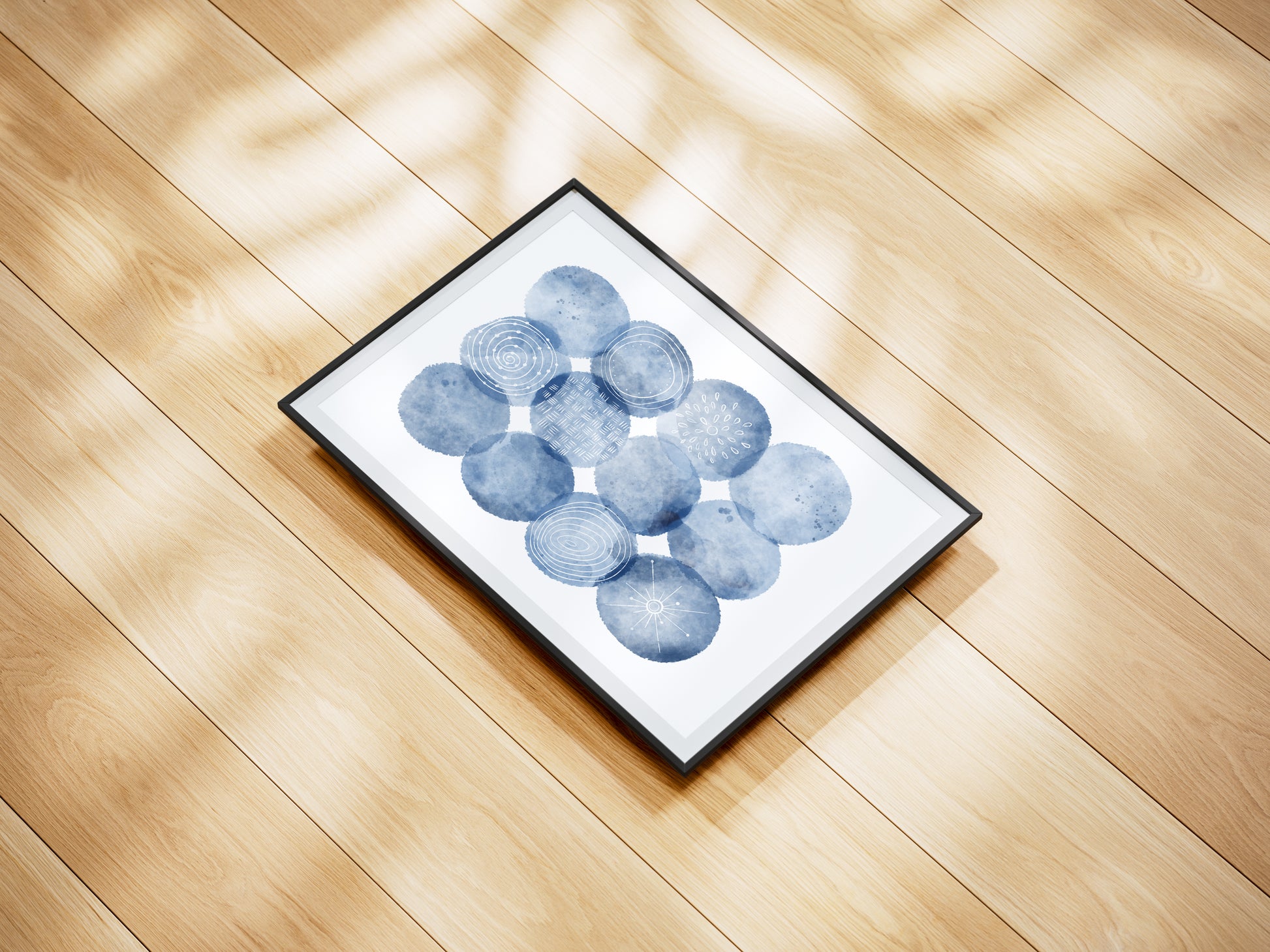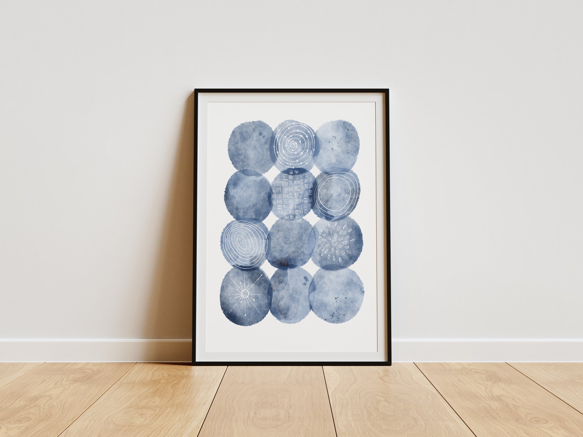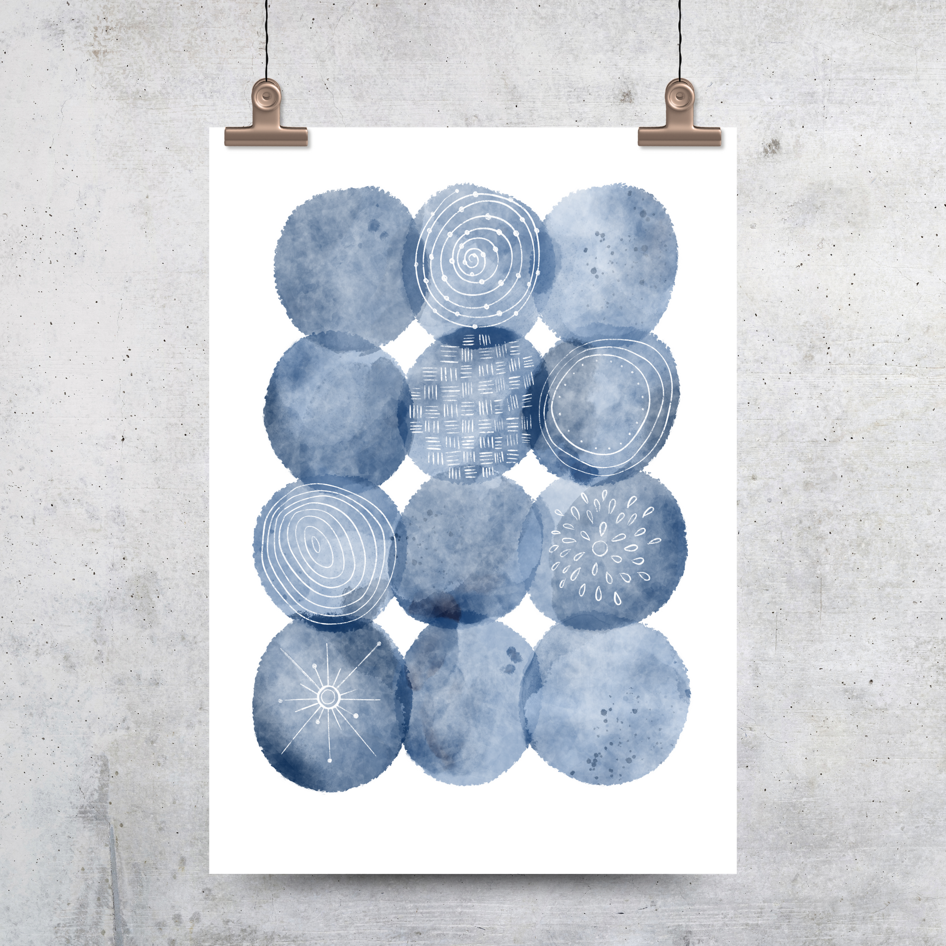 Encontre uma obra de arte que combina simplicidade e elegância, destacando-se pela beleza dos círculos em aguarela azul, complementados por motivos em fineliner branco. Com um design minimalista e sofisticado, é perfeita para quem procura adicionar um toque de serenidade ao seu espaço.