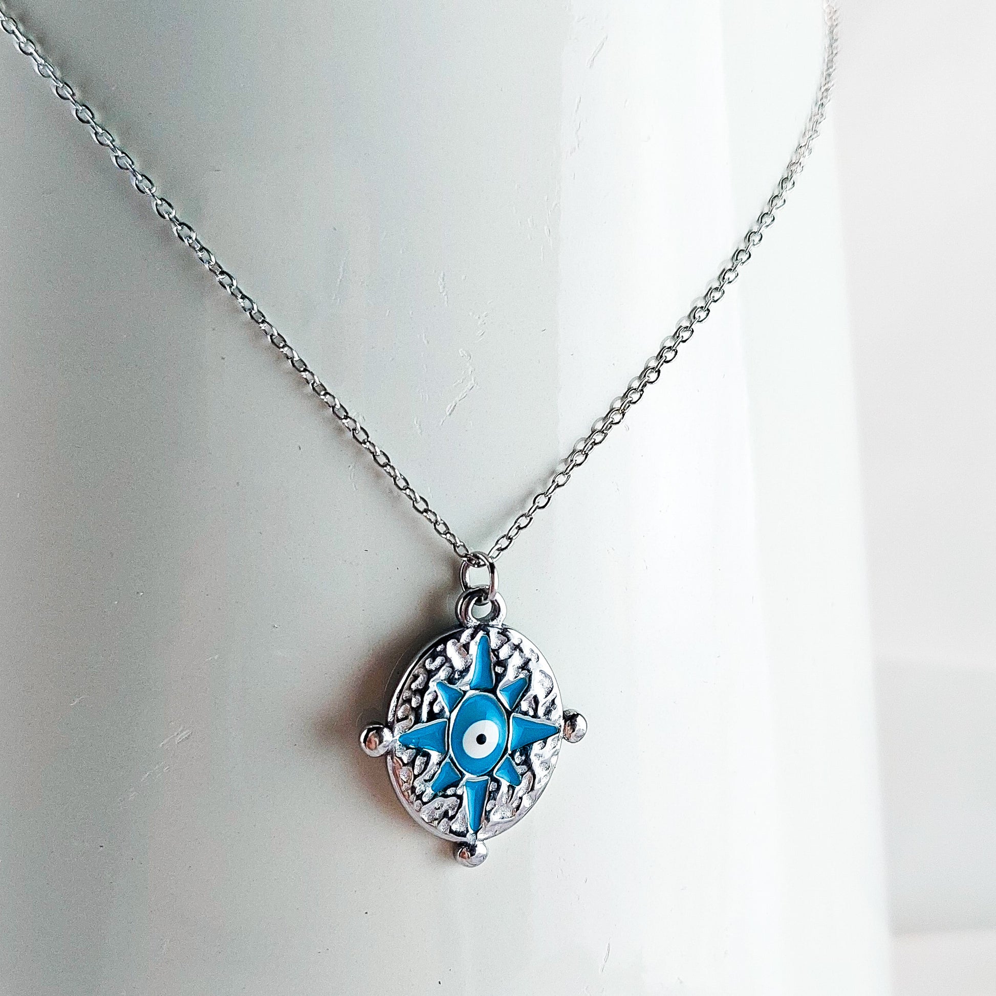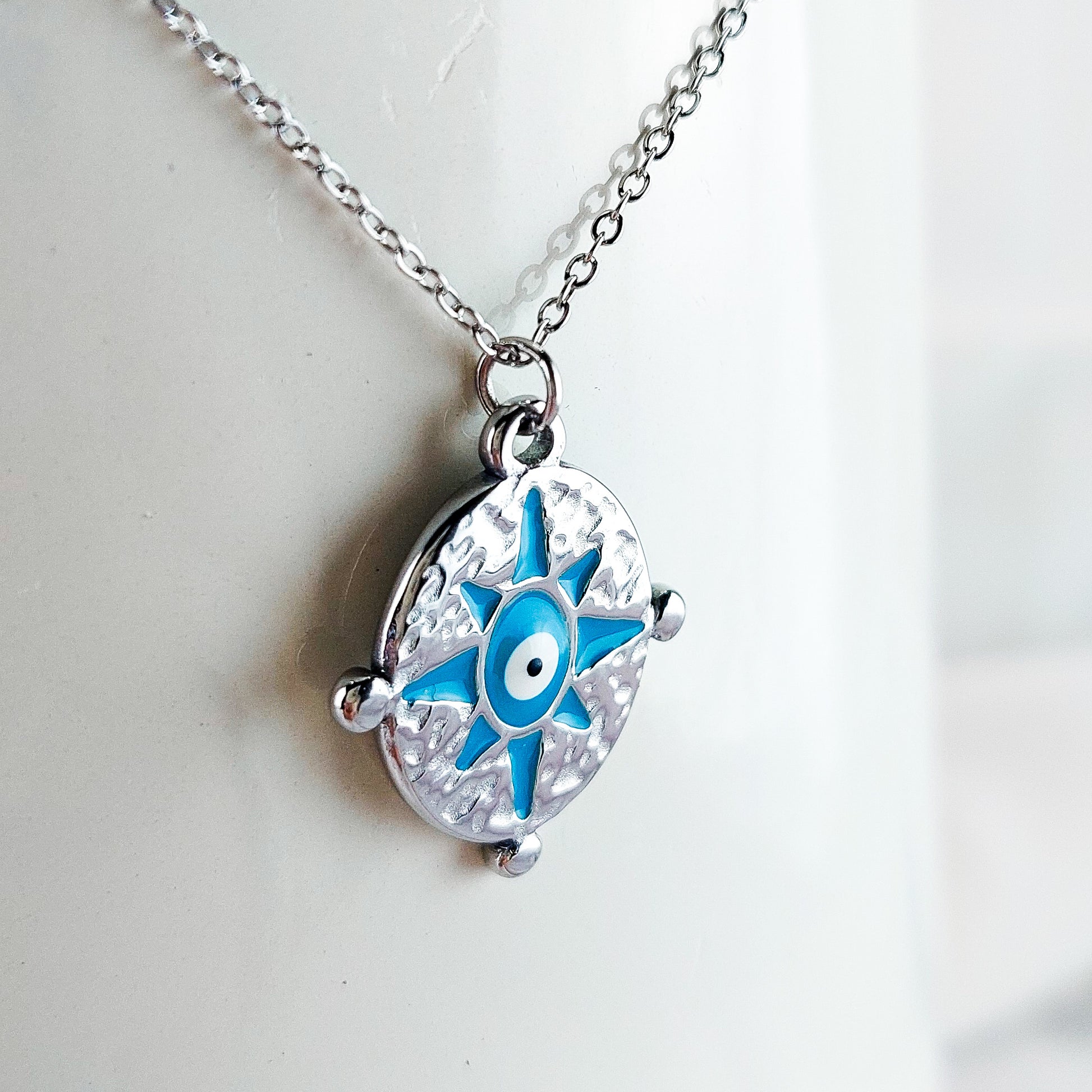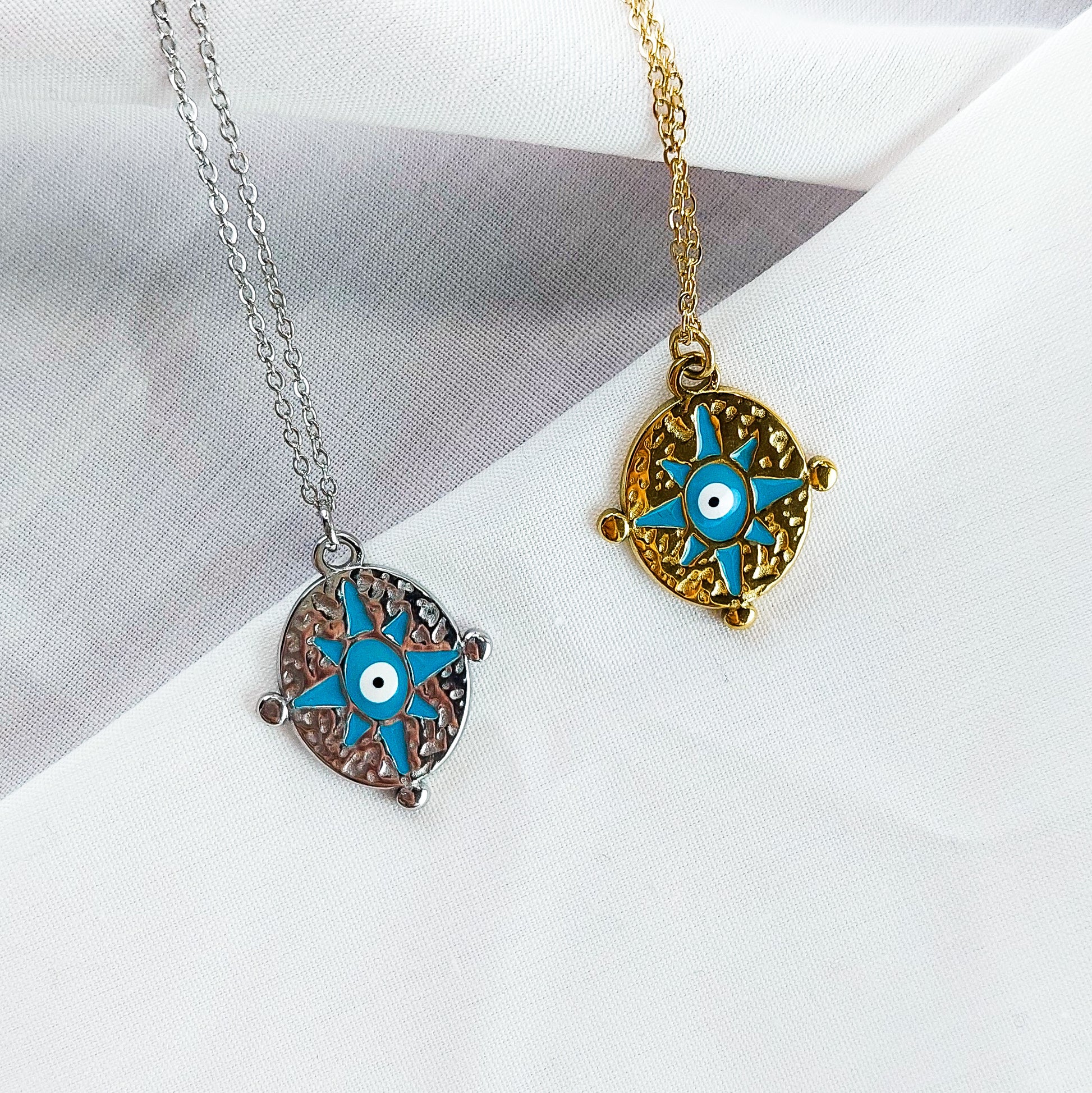 Este colar elegante combina a durabilidade do aço inoxidável com um toque místico e protetor. A corrente em aço inoxidável sustenta um pendente em aço inoxidável martelado, adornado com um olho turco azul vibrante, criando uma peça que é simultaneamente moderna e cheia de significado.