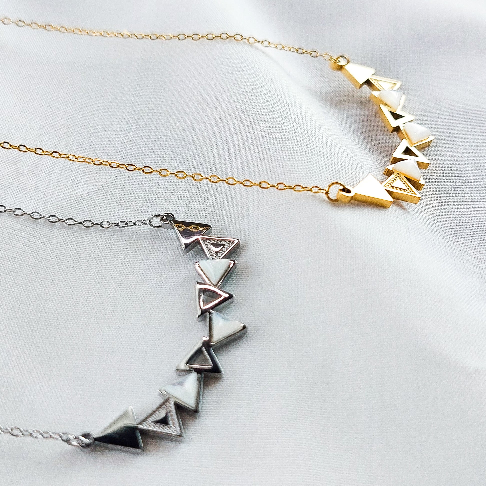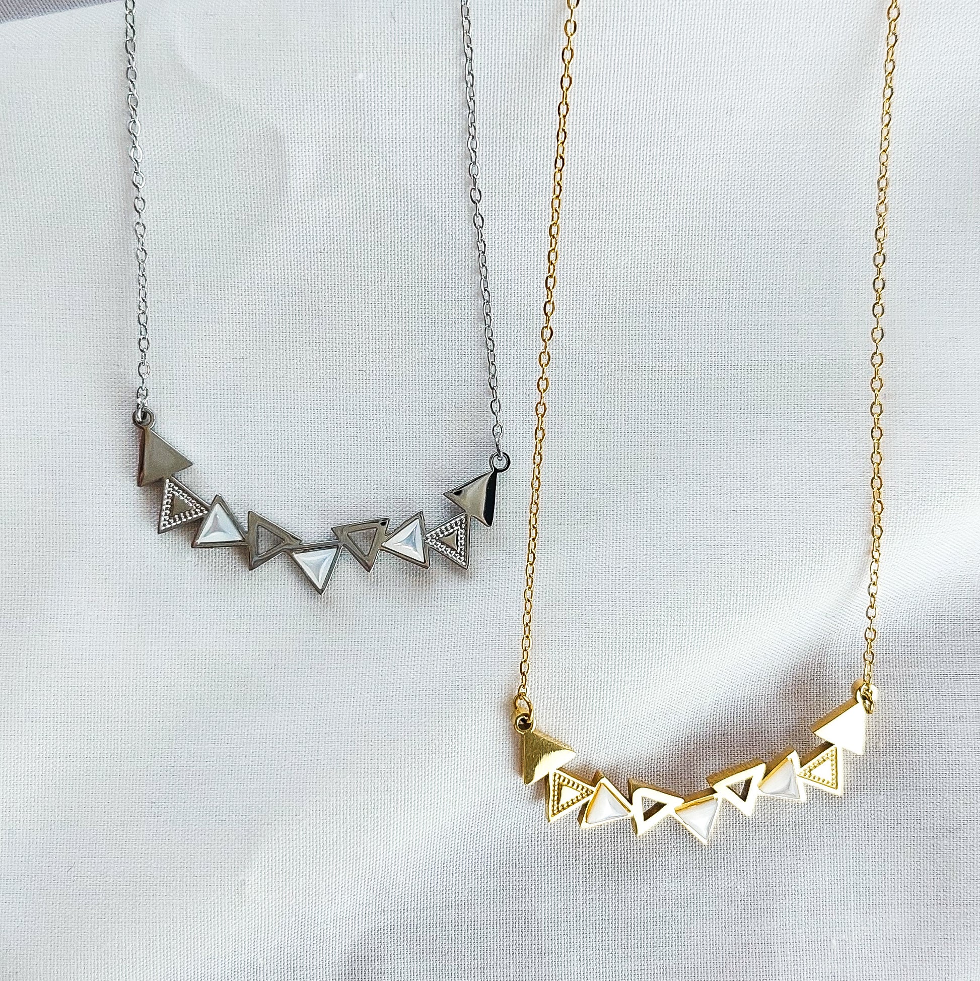 A madrepérola, com o seu brilho suave e iridescente, simboliza pureza e beleza. Este material natural é conhecido por trazer tranquilidade e harmonia, tornando este colar não apenas uma peça estética, mas também um amuleto de boas energias. A forma triangular dos pendentes acrescenta um toque geométrico e moderno, perfeito para quem aprecia um estilo minimalista e elegante.