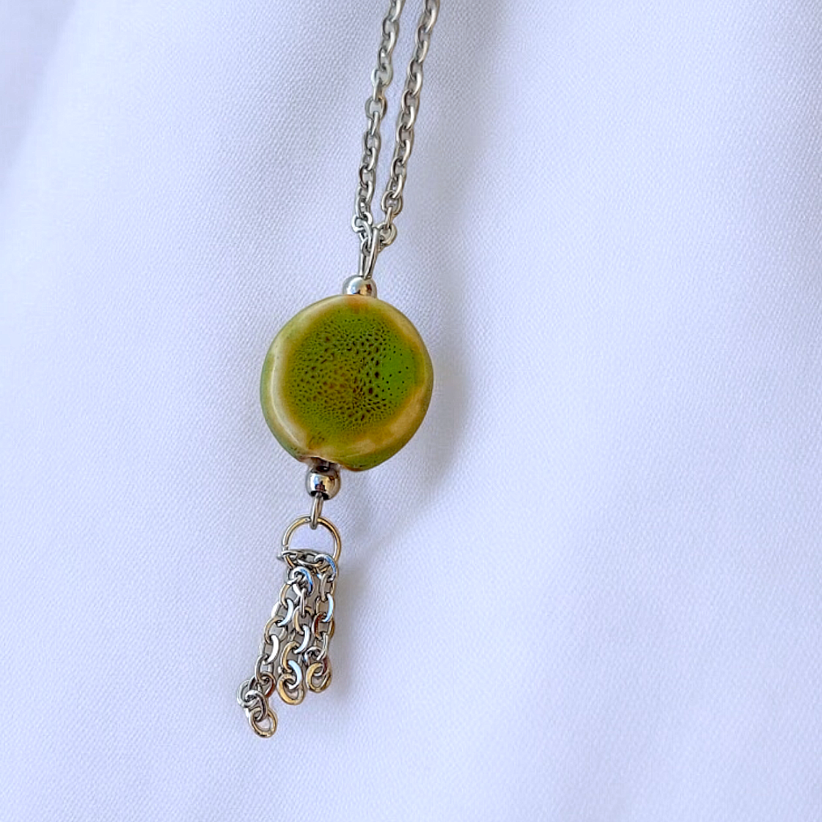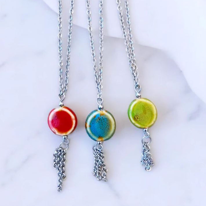 O pendente em forma de corrente de aço inoxidável complementa o design, evidenciando a atenção aos detalhes e a combinação de arte com um design refinado. As peças de cerâmica são artesanais, tornando cada colar verdadeiramente único.