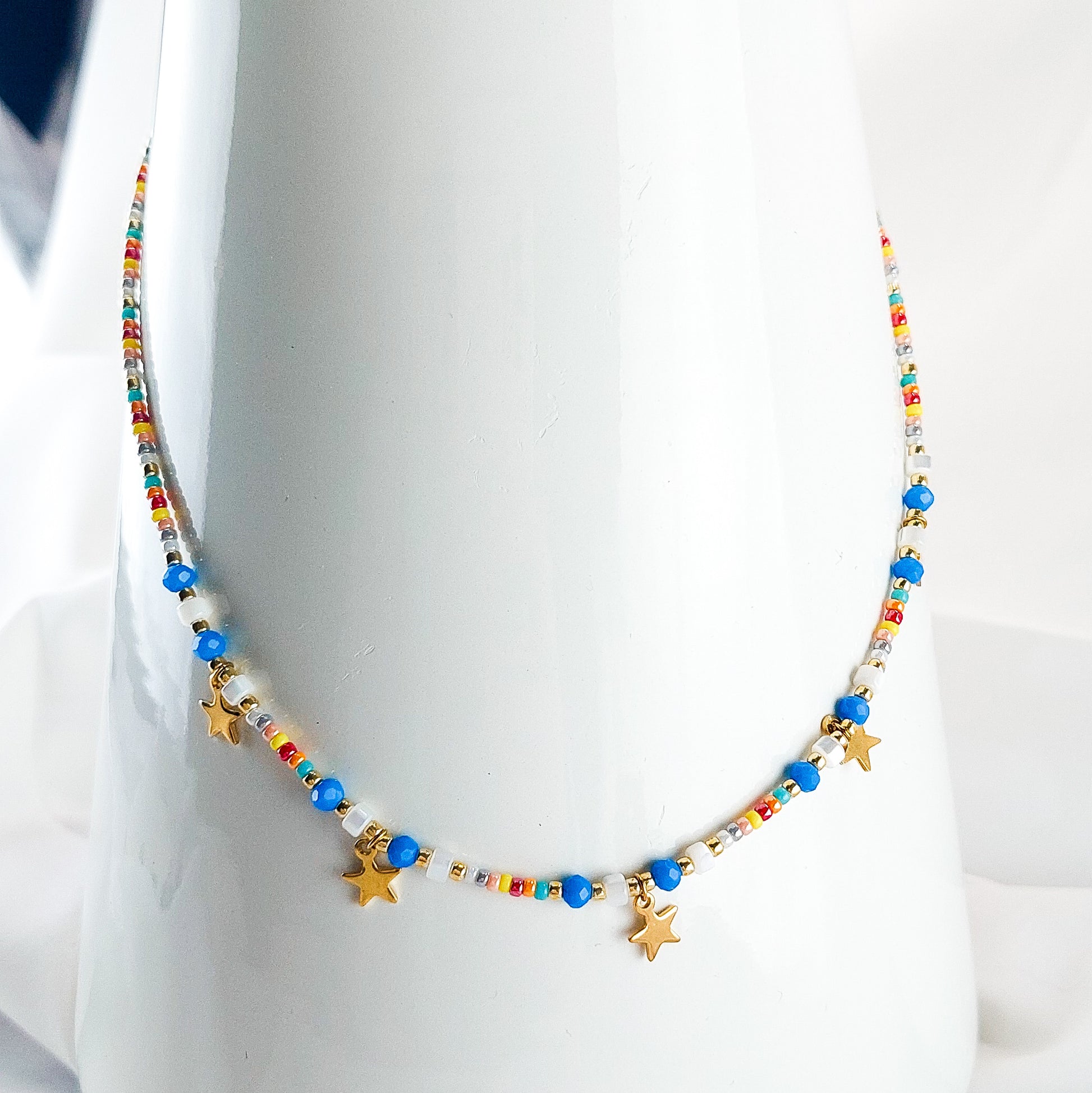 Este colar vibrante é uma celebração da cor e da alegria, combinando missangas coloridas com pequenos pendentes de estrelas douradas. A corrente em aço inoxidável confere durabilidade e um toque moderno, tornando esta peça perfeita para quem deseja adicionar um pouco de brilho e diversão ao seu estilo.