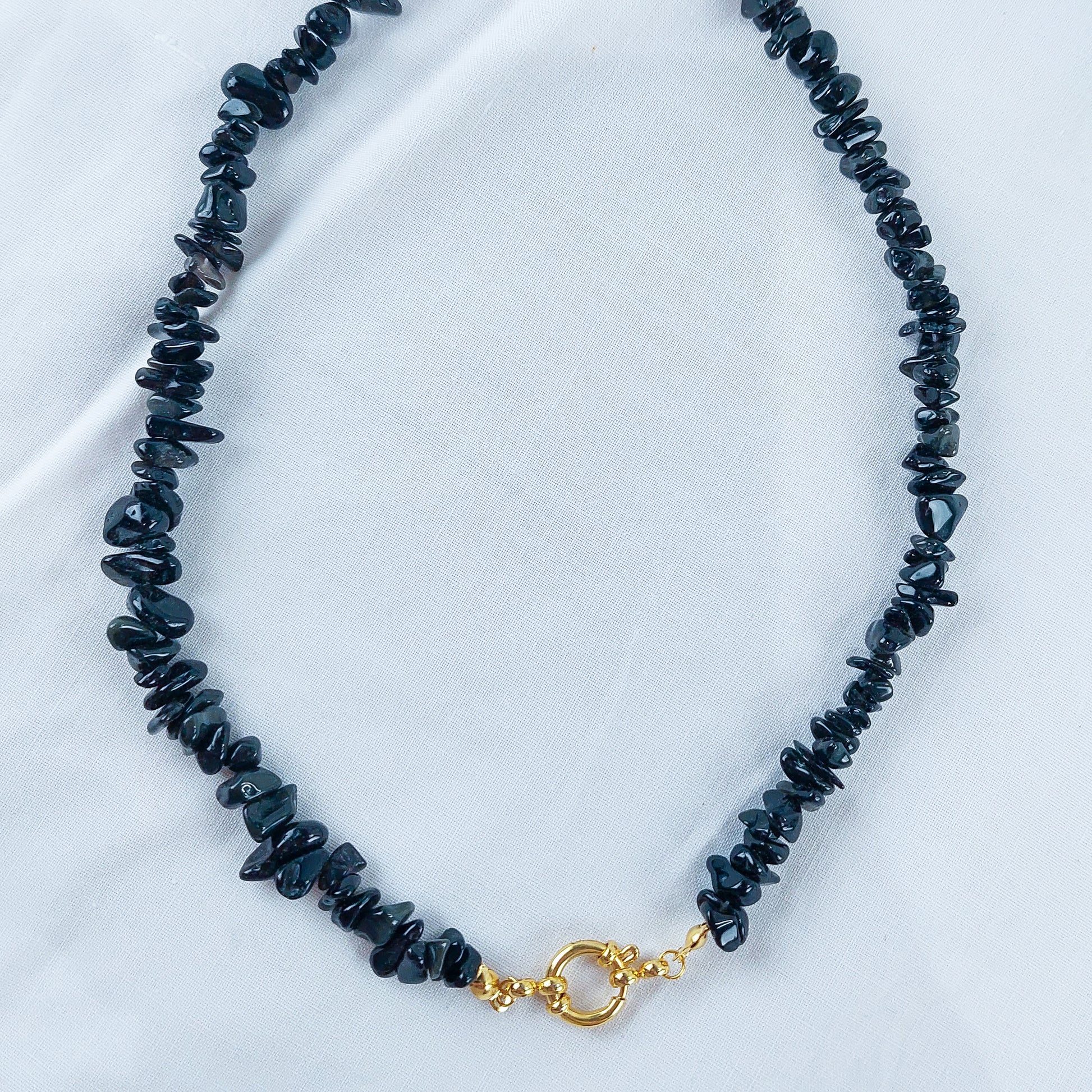 - Material: Chips de obsidiana natural e aço inoxidável dourado