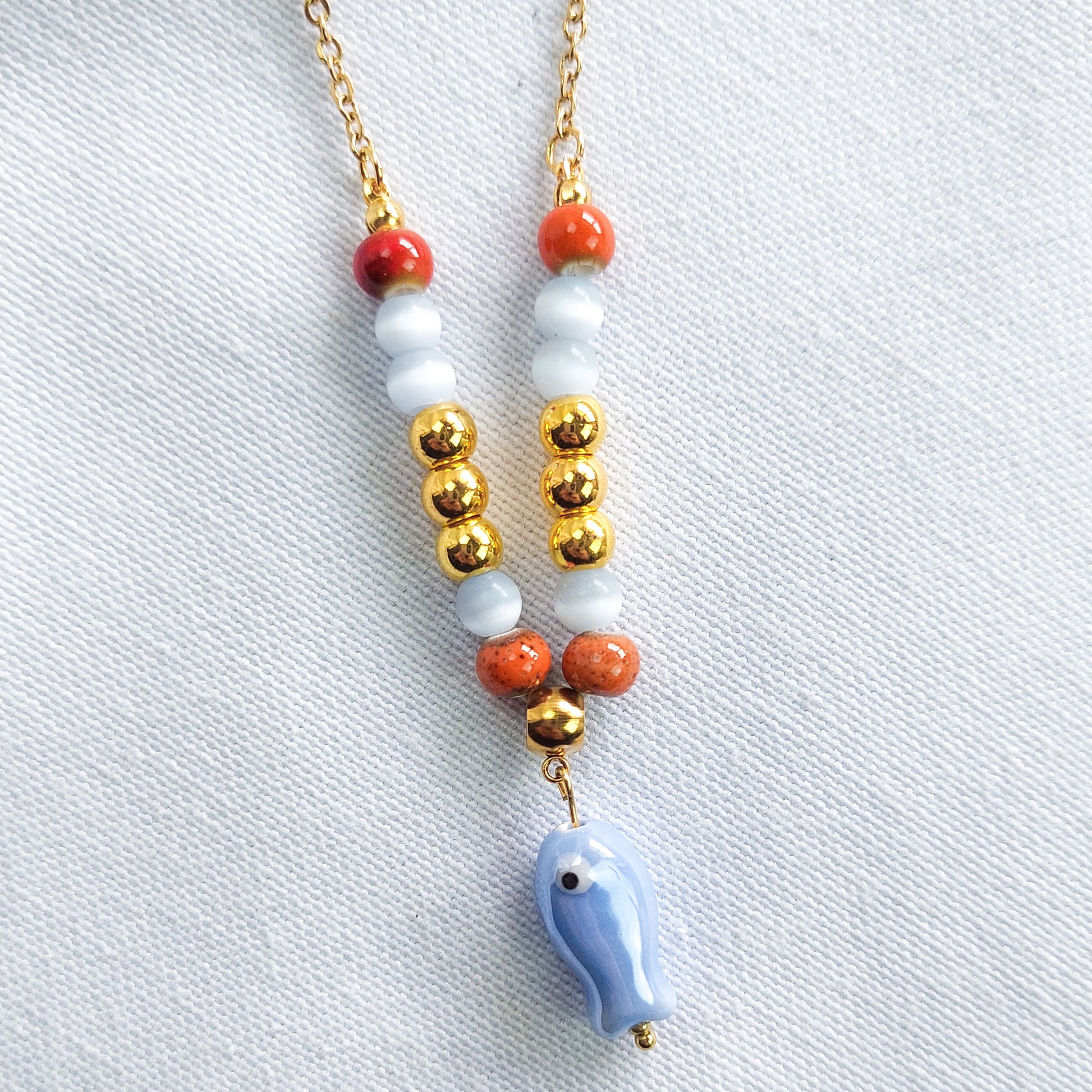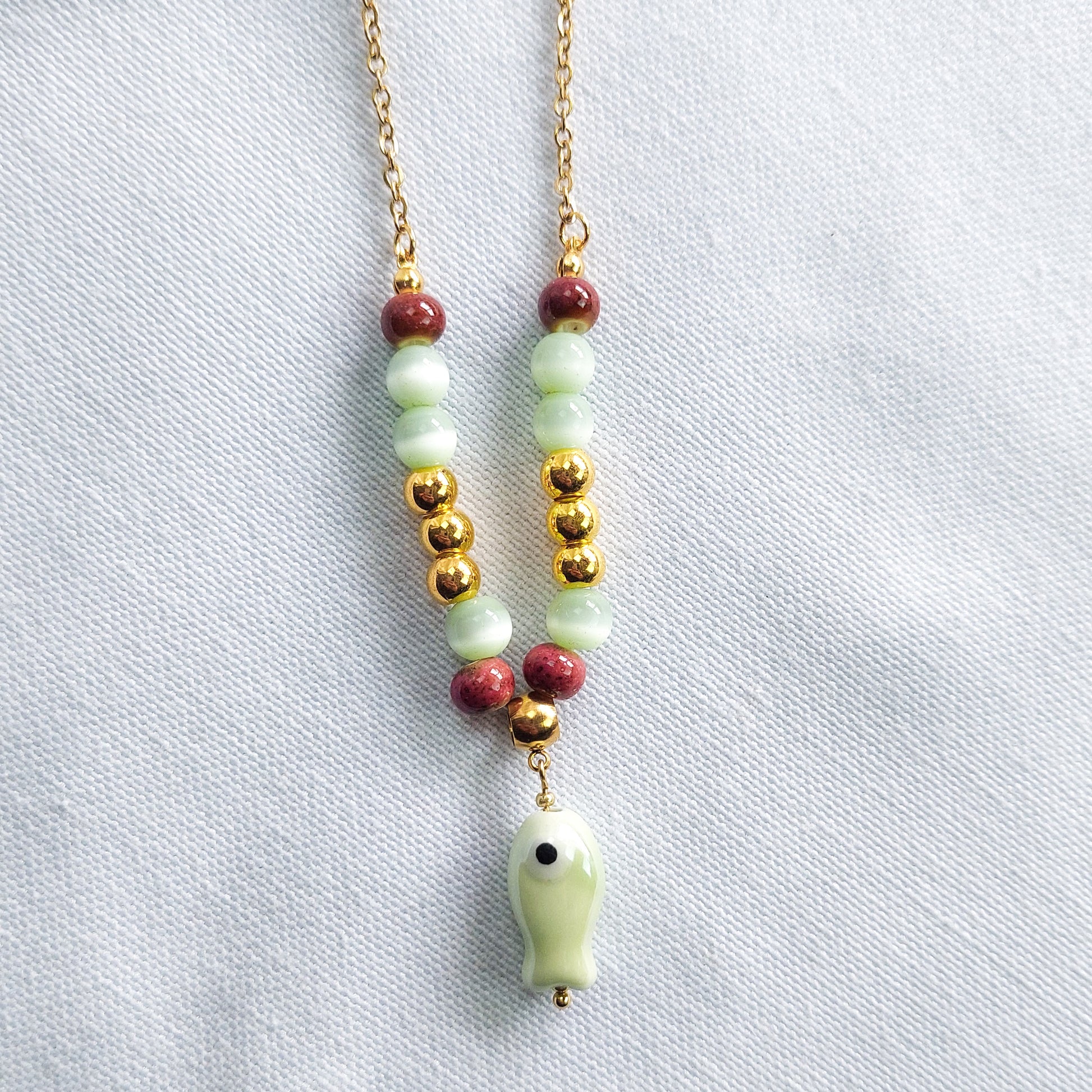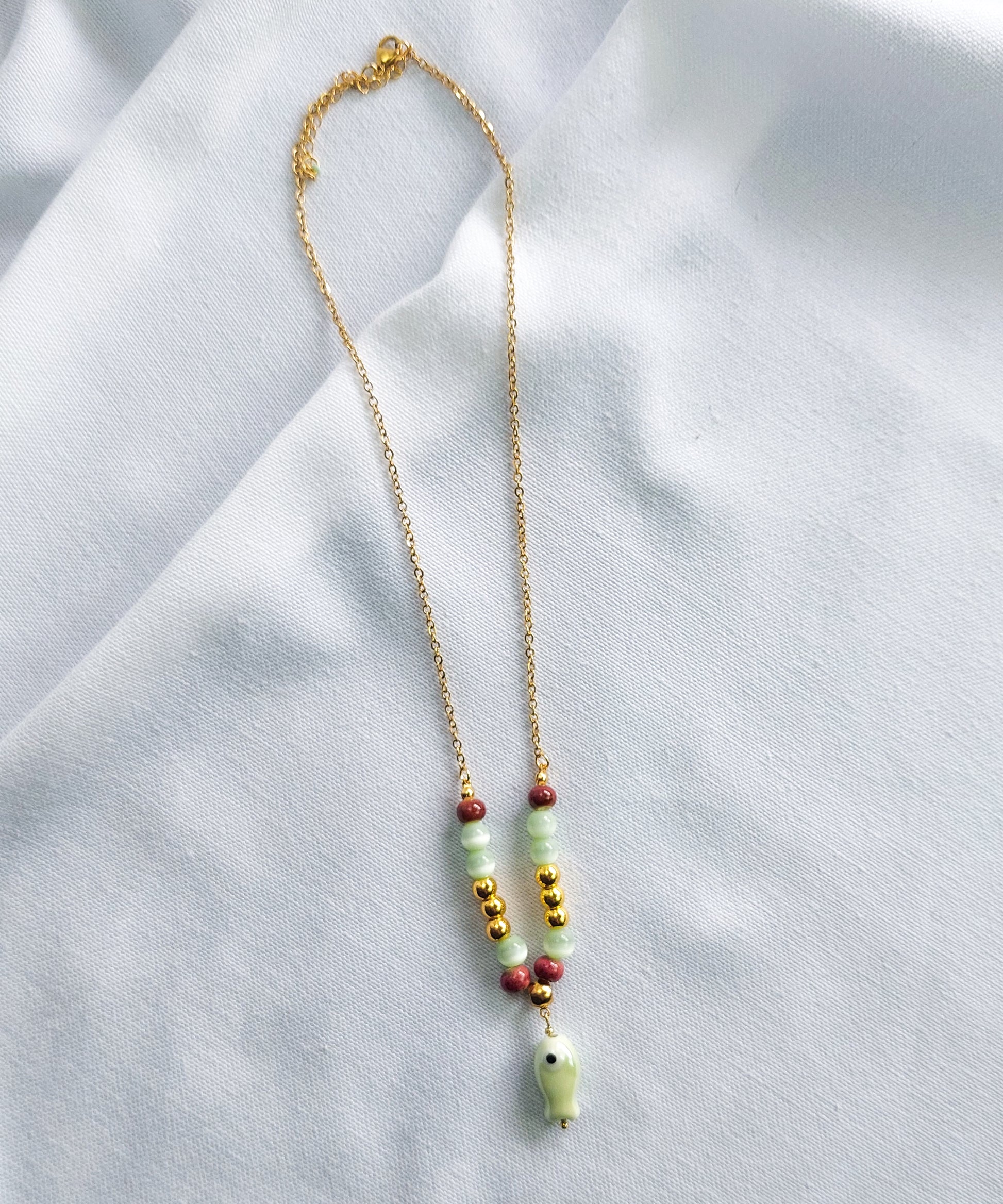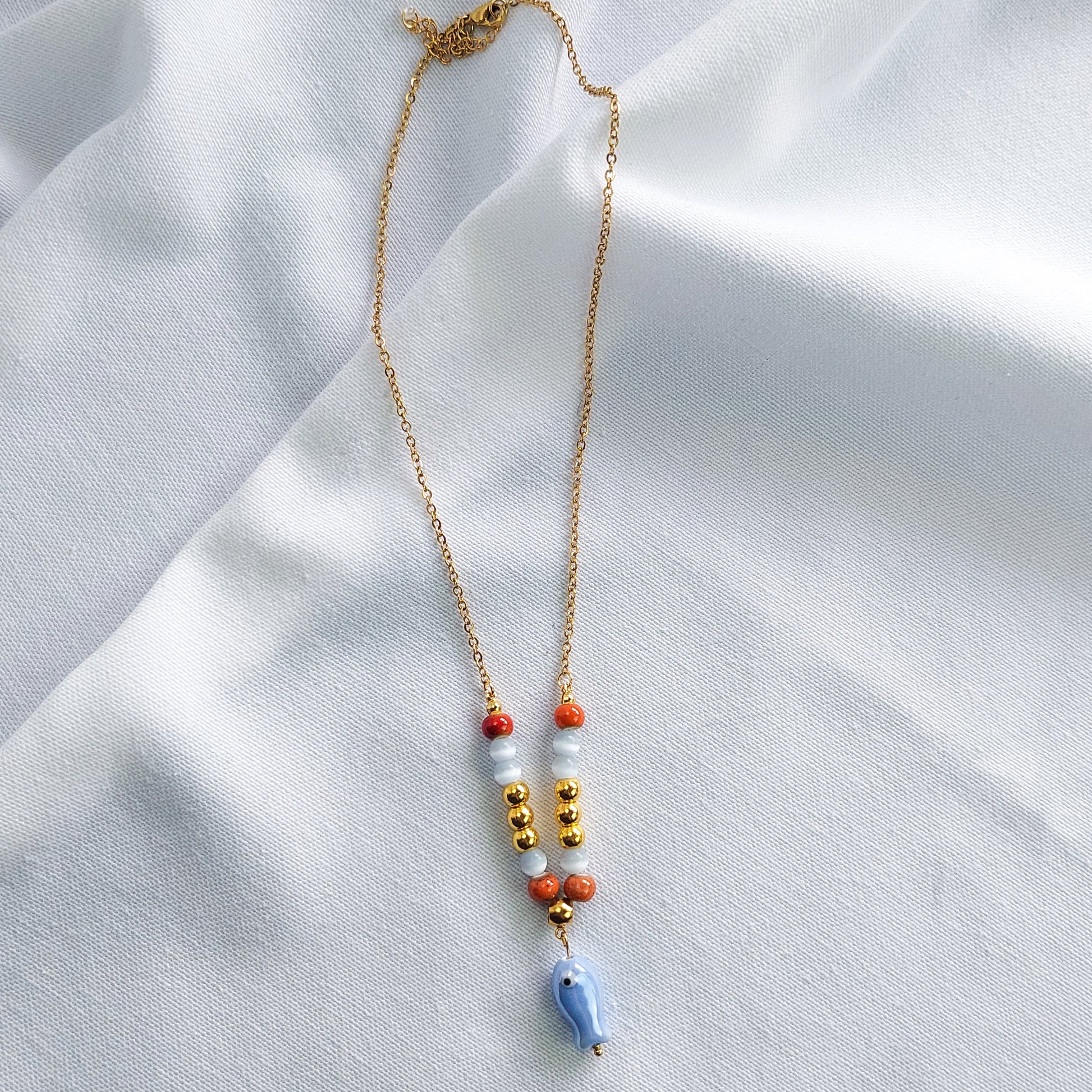 O destaque deste colar é o pendente de peixe em cerâmica, símbolo de liberdade e renovação, que acrescenta um charme especial à composição. As contas coloridas criam um contraste harmonioso e cheio de energia, evocando a vitalidade do verão e a beleza da natureza.