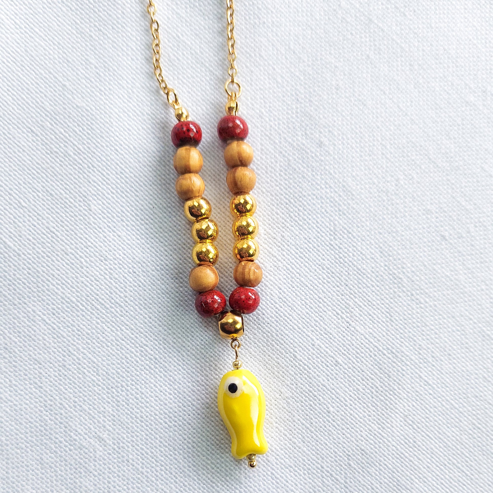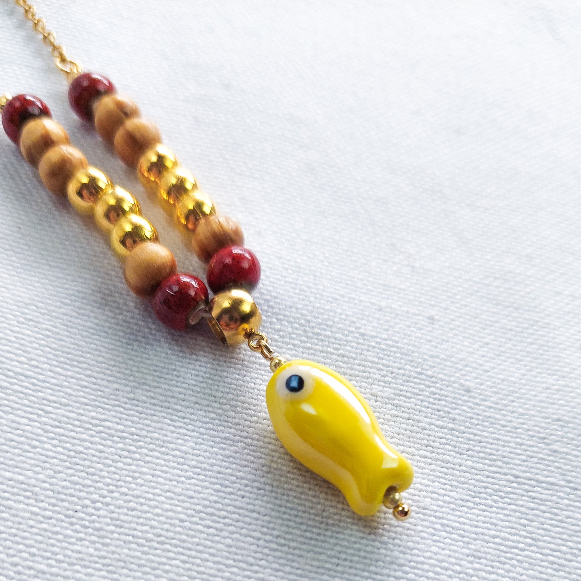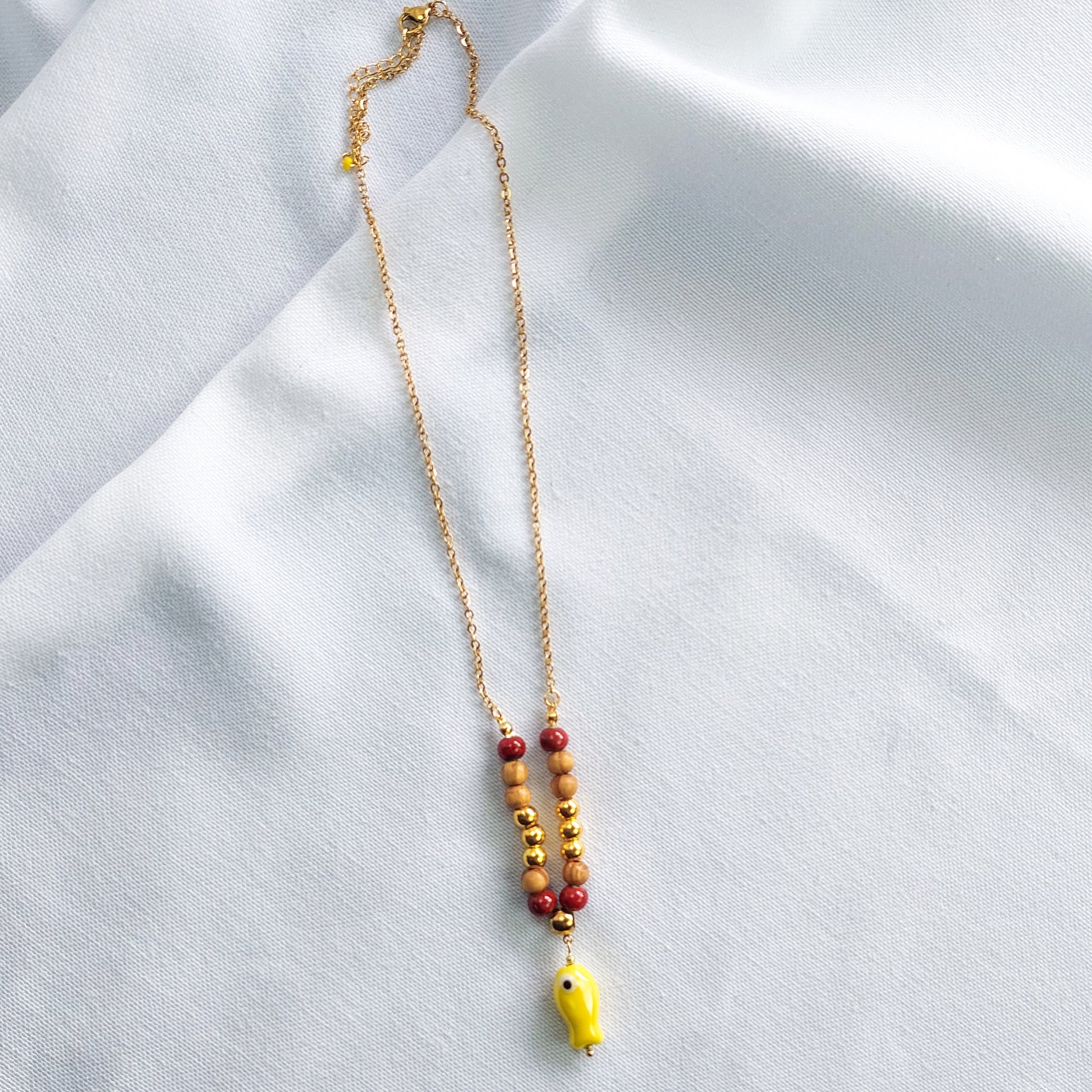 Adicione um toque vibrante e originalidade ao seu visual com o nosso colar delicado, composto por contas de cerâmica vermelha, contas de madeira natural e pequenas esferas douradas, finalizado com um pendente de peixe amarelo em cerâmica pintada à mão. A corrente fina em aço inoxidável dourado confere leveza e sofisticação, tornando esta peça perfeita para quem procura acessórios únicos e cheios de personalidade.