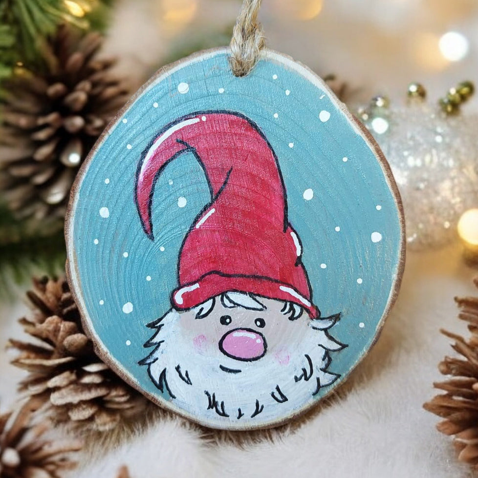 Adicione um toque especial e artesanal à sua decoração natalícia com este encantador ornamento de Natal, pintado à mão e feito em madeira natural. Cada peça é única, preservando a beleza rústica e natural da madeira.