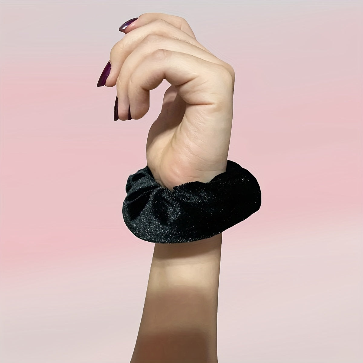 Feito com tecido de veludo elástico preto, este scrunchie combina conforto e elegância, sendo perfeito para qualquer ocasião. O elástico interno garante uma fixação segura sem danificar o cabelo.