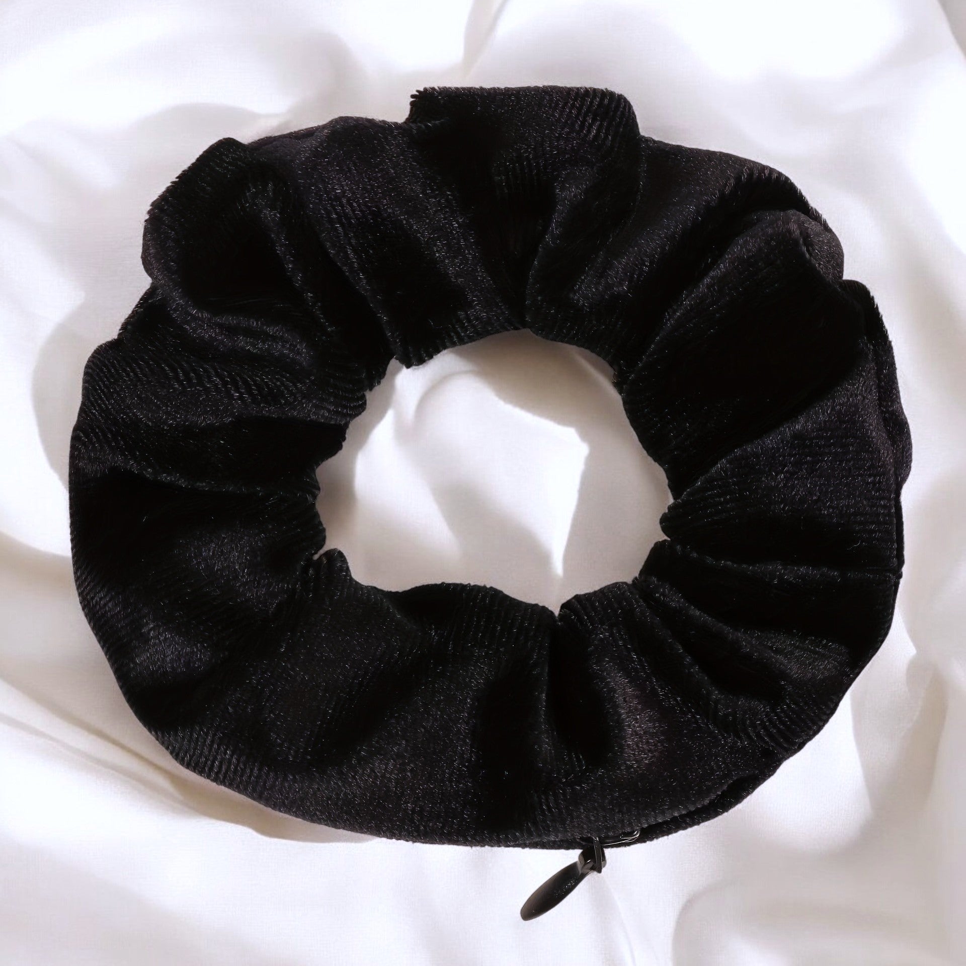 - Tipo: Scrunchie (elástico de cabelo) com fecho zipper