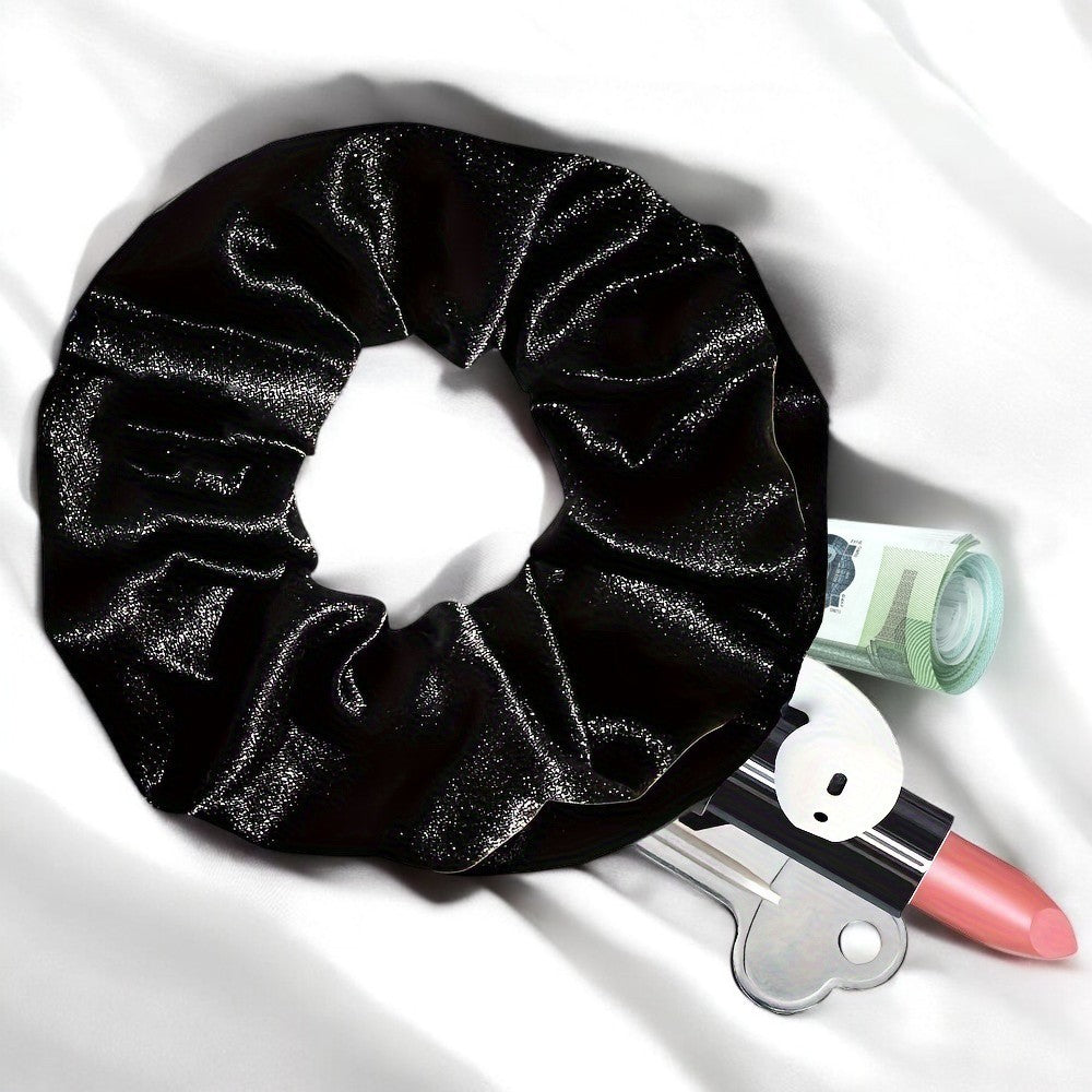 Adicione um toque de sofisticação e funcionalidade ao seu visual com o nosso scrunchie em veludo preto. Além de manter o seu cabelo no lugar com estilo, este scrunchie possui um fecho zipper prático, permitindo que você guarde pequenos objetos de forma segura, como anéis, brincos ou até mesmo uma chave.