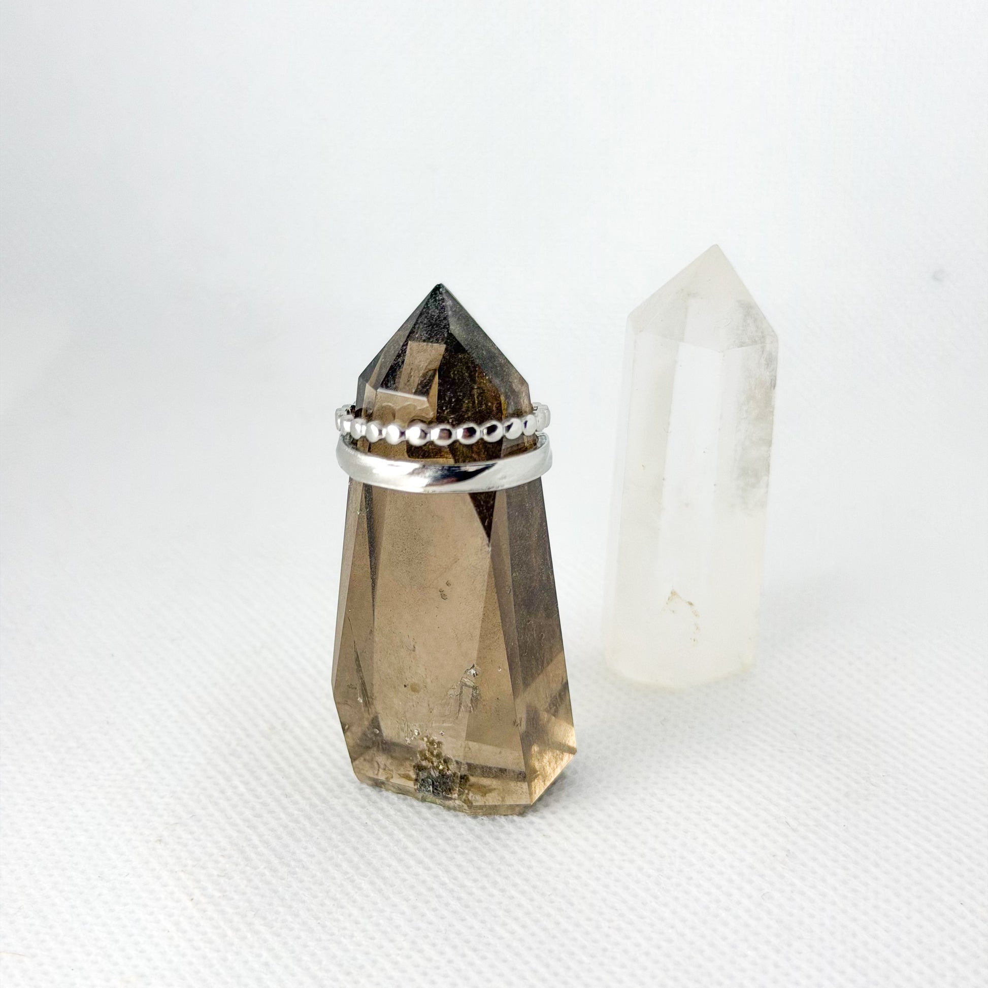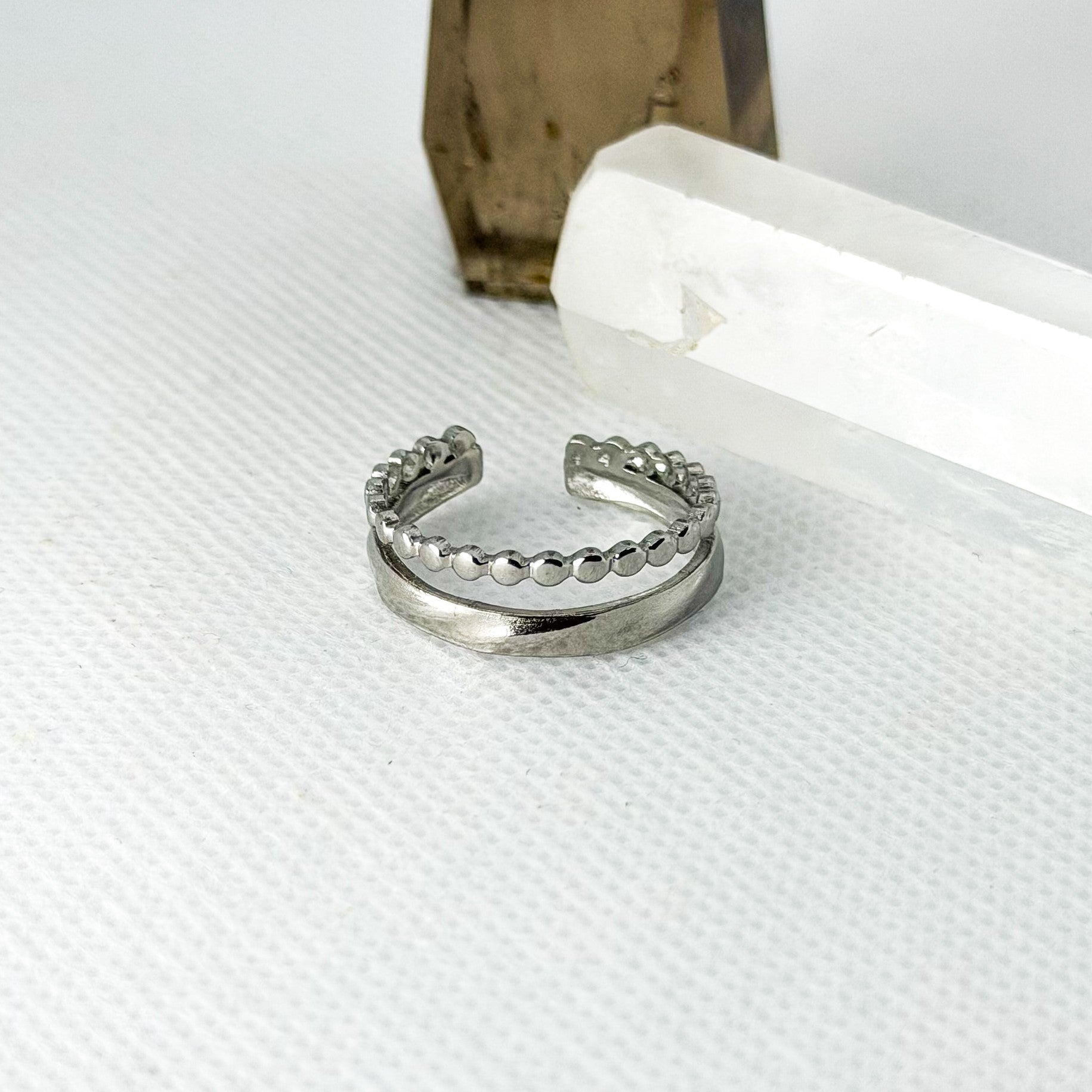 Este anel de design duplo combina duas texturas distintas: uma linha minimalista de esferas delicadas e uma faixa lisa clássica. É a peça ideal para quem procura o efeito de "stacking" (anéis sobrepostos) com a praticidade de uma única peça.