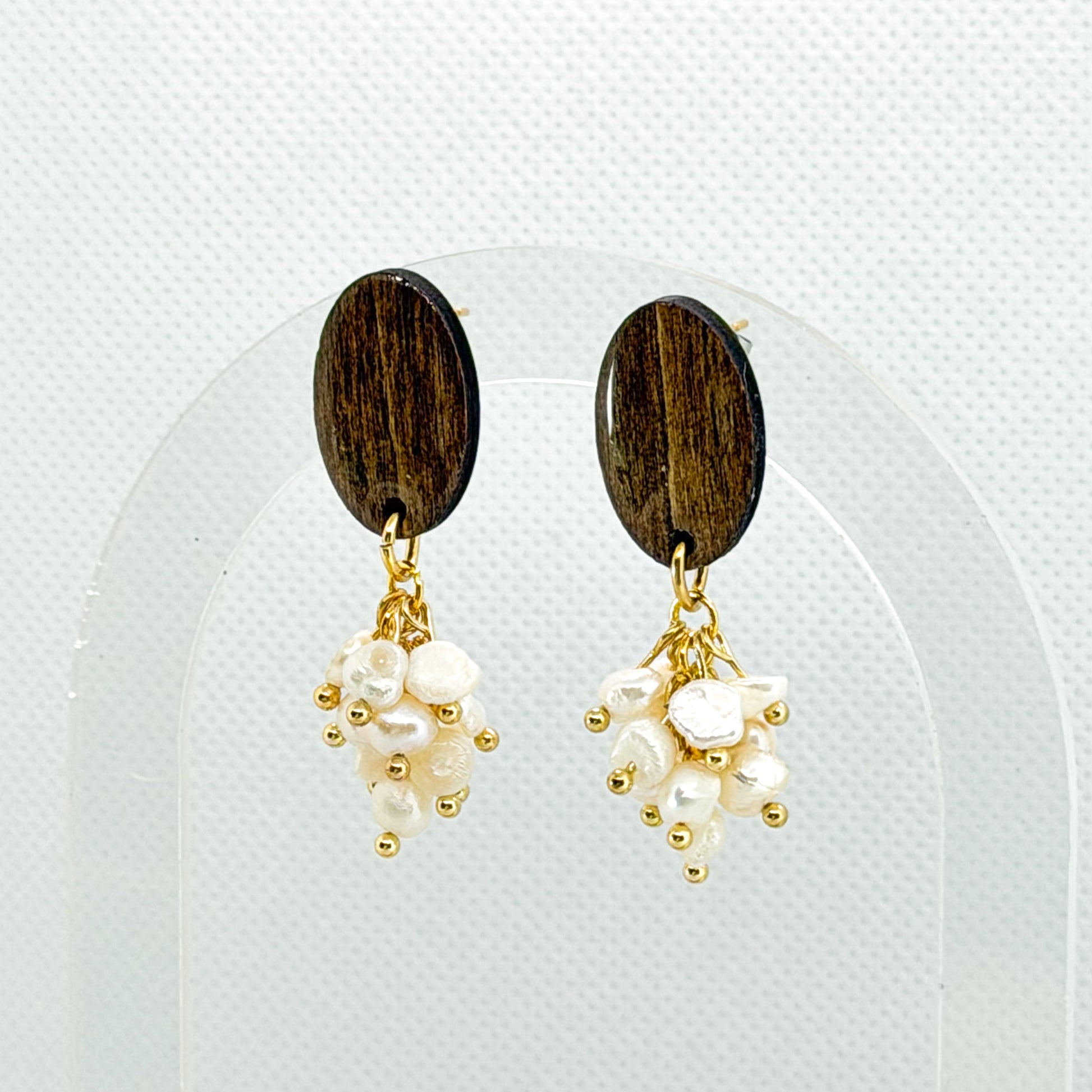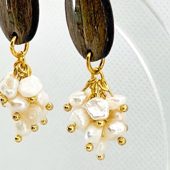 Compostos por uma base oval em madeira de tom profundo e um pendente em "cacho" de pérolas de água doce, os Cluster foram desenhados para a mulher que valoriza a elegância orgânica e o detalhe artesanal. O contraste entre o grão da madeira e o brilho iridescente das pérolas cria uma peça de declaração que se destaca pela sua originalidade.