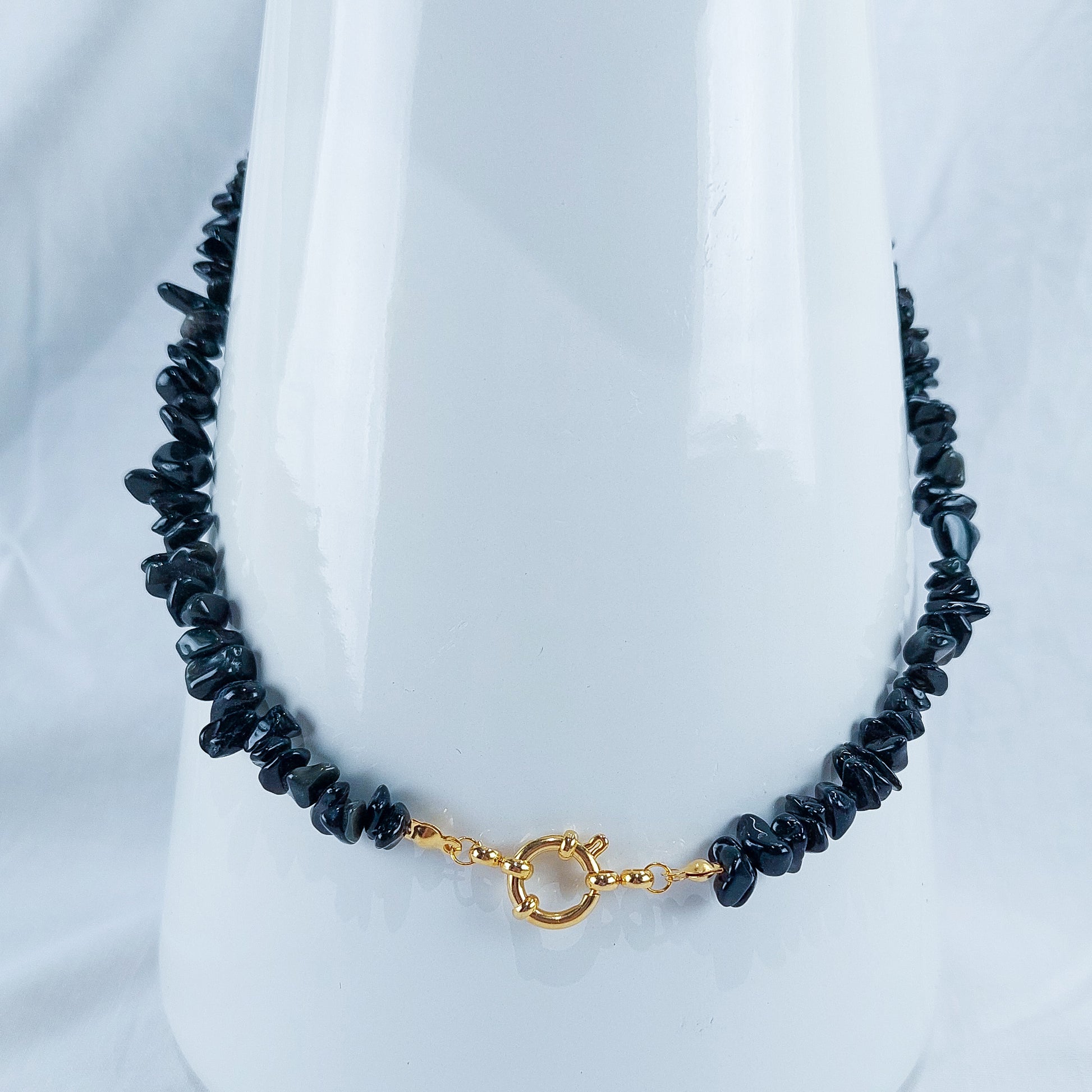 - Material: Chips de obsidiana natural e aço inoxidável dourado
